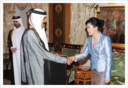 Doha, May 15 (QNA) - HH the Emir Sheikh Hamad bin Khalifa Al Thani met today at Al Wajba Palace Thailand's Prime Minister Yingluck Shinawatra and her accompanying delegation. During the meeting existing ties of cooperation and means to enhance them were discussed. (QNA) (link here)